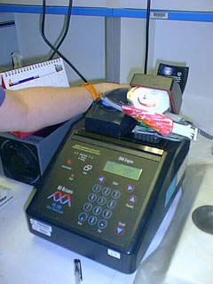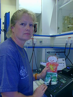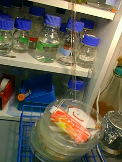"They don't keep food in these refrigerators." Uncle Robert replied. "These are for experiments." Stanley found that quite odd. As they walked into another room, a woman looked up from her desk. Uncle Robert introduced Stanley to her. "Stanley, I'd like you to meet a friend of mine. This is Tina, she is a DNA scientist. Tina, this is Flat Stanley. Stanley is visiting from San Diego." "My you're flat." Tina observed. "Flat enough to fit in an envelope." Stanley replied. "What is a DNA scientist?" "I make exact copies of things, especially very small bugs. I do it by copying the DNA inside the bug's bodies." Tina tried to explain, but Stanley scratched his head in confusion. Uncle Robert spoke up. "Tina, I was wondering if we might use Stanley's DNA to make copies of him. You see, he wants to visit both Cambodia and Hong Kong -- at the same time." Tina thought for a moment. She looked Stanley over. "I'm not sure. Normally, DNA in the body is all coiled up, but I think Stanley's DNA has gone all flat. We'll have to do something about that first." "Stanley," she asked, "is it okay with you if we try to make copies of you?" Stanley considered it for a moment, and realizing that this would allow him to be in two places at once, responded, "Yes, I'll do it!" Tina led Stanley to a big machine. She opened the top and placed him at the bottom. "This machine is going to spin you around in circles. It goes very fast. It should help spin your DNA back into a coil." Stanley was a little frightened. Around him were glass jars full of colored liquids. As Tina closed the top, the machine began to spin. "Whhhhhhooooooooo yeeeeeeeeeeeeaaaa!" Around and around he went. It felt like his insides were getting all mixed up. After a few minutes, Tina opened the top and the machine came to rest." "It looks like your DNA is back to normal now." She told him.
