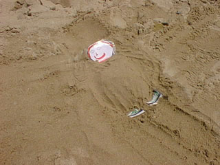 "Why don't we bury you in the sand?" asked Aunt Louise. Stanley was all for it. With Flat Stanley being so... flat, it didn't take much sand to cover him up. Aunt Louise was careful not to put sand on his head. She even let his feet peek out so that he could wiggle his toes.